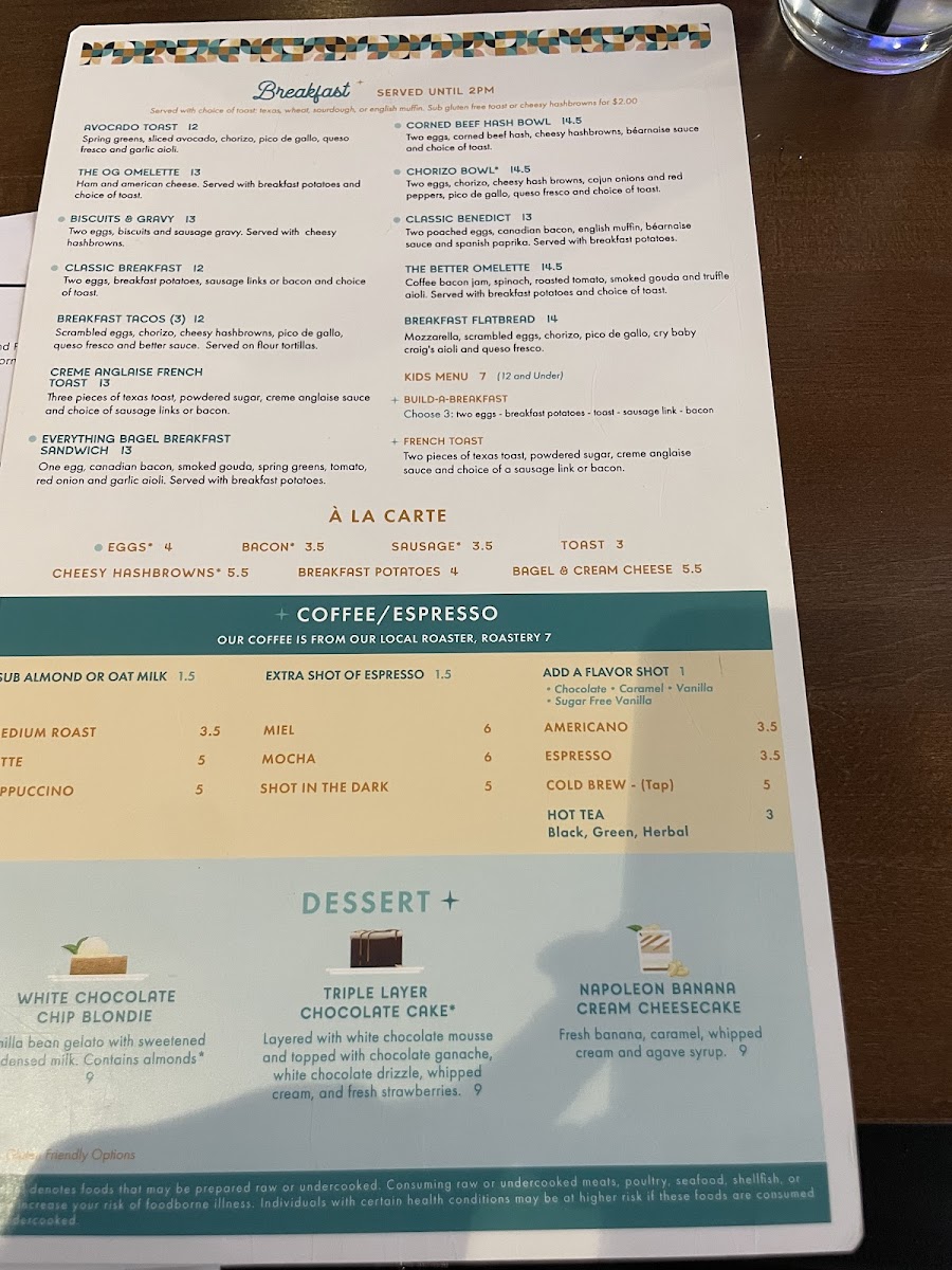 scrambled egg / bacon / american cheese / better sauce / spring greens / croissant bun / breakfast potatoes
